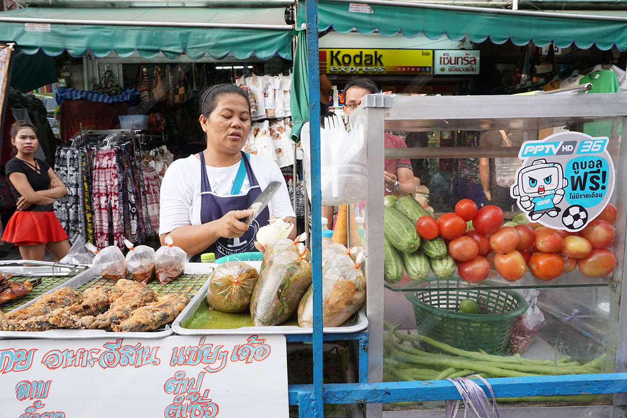 ถัดมาอีกหน่อยไปเจอร้านส้มตำและร้านไข่ปิ้ง โอ๊ะ! มีสตรีทฟู้ดแบบนี้ด้วย แล้วแบบคือไม่มีที่นั่งด้วยนะจ๊ะ ใครสั่งมาทานก็เดินทานไปเรื่อยๆ นี่แหละสีสันการกินอาหารข้างทางเมืองไทย ใครไม่เคยมีประสบการณ์แบบนี้ ถือว่าพลาดอย่างแรง