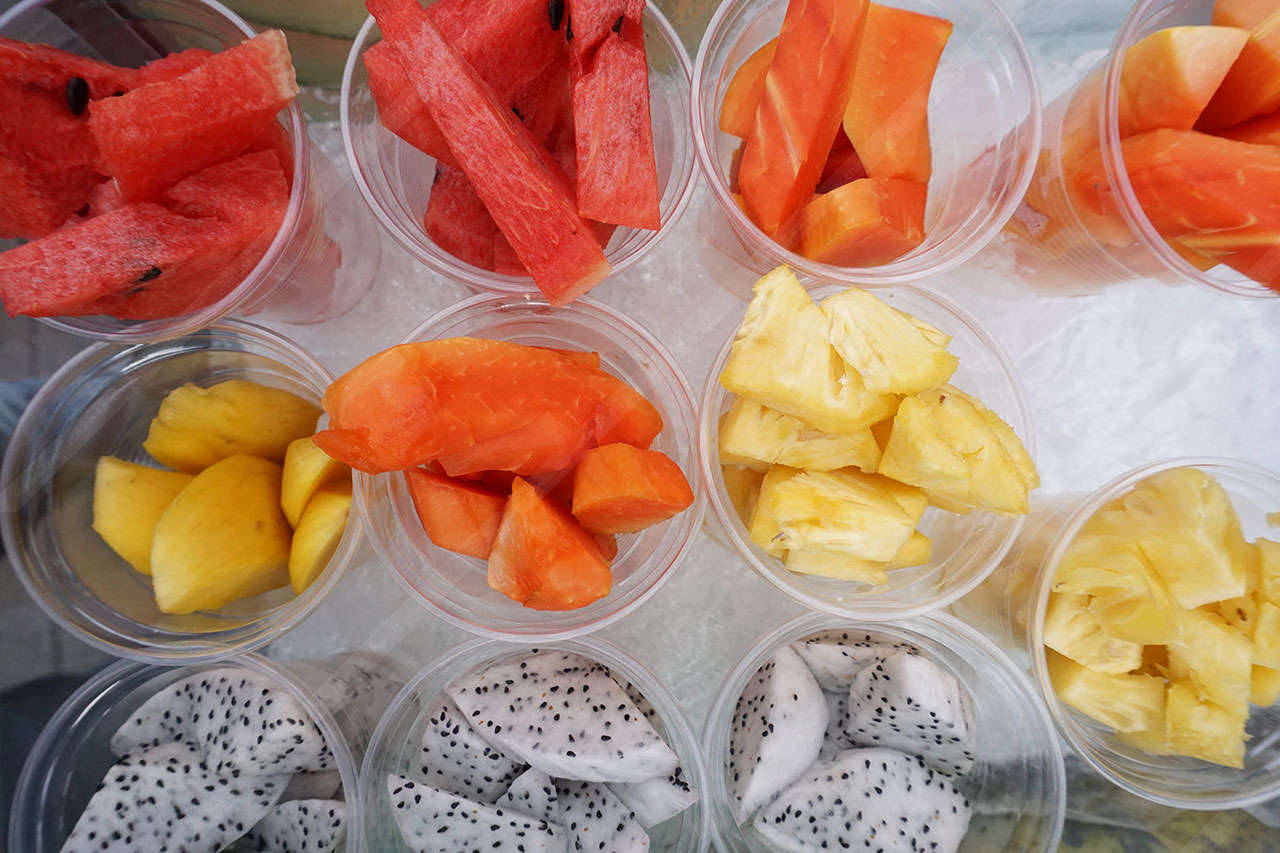 มาถึงร้านผลไม้รถเข็นที่ต่างชาติค่อนข้างให้ความสนใจ เราเดาว่าที่บ้านเขาคงไม่มีแบบนี้ ร้านผลไม้ตัดเป็นชิ้นๆ วางเรียงในตู้กระจกที่อัดแน่นไปด้วยน้ำแข็ง ทำให้เราได้ทานผลไม้หวานฉ่ำ เย็นสดชื่น เราลองซื้อมะม่วงสุกมาทาน สนนราคาแก้วละ 20 บาทเท่านั้น อร่อยชื่นใจ
